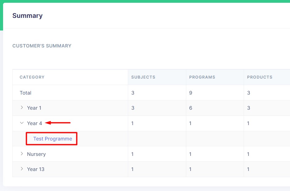 Once you click on a Year Group accordion, the Summary Table expands to show the number of Subjects, Programs, Products and Students in each Programme. A click on a Programme name (in the first column) will open the Programme Details page.