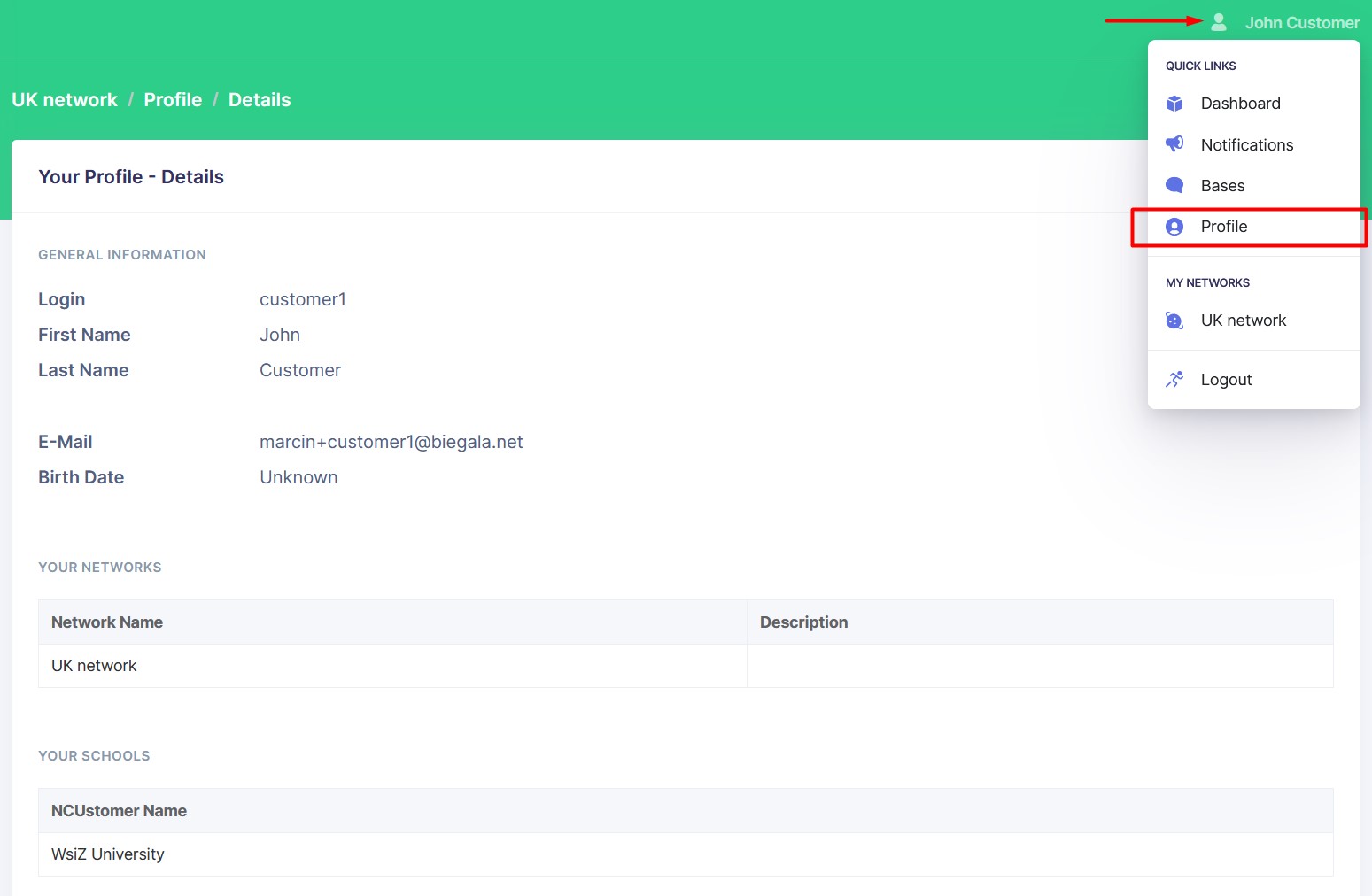 The Profile page contains general information about the user and a list of the user's Networks and Schools.