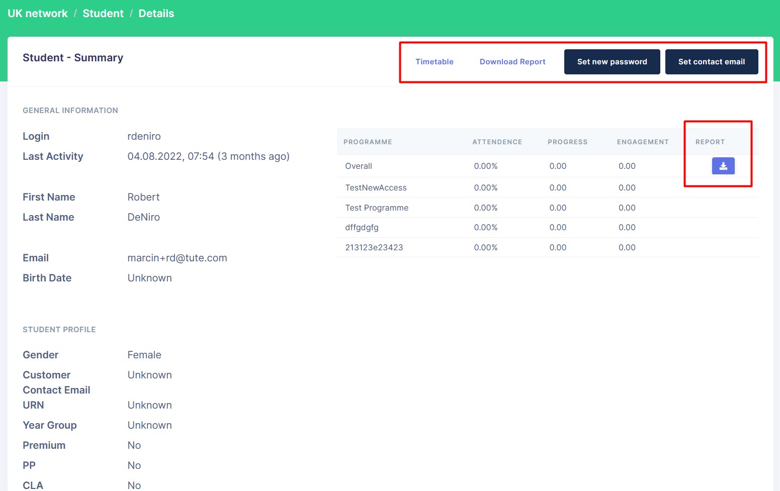 Once you click on a student name (in the first column) it will open the Student Details page. Same can be done by clicking on the 'info' icon in the Actions column.
